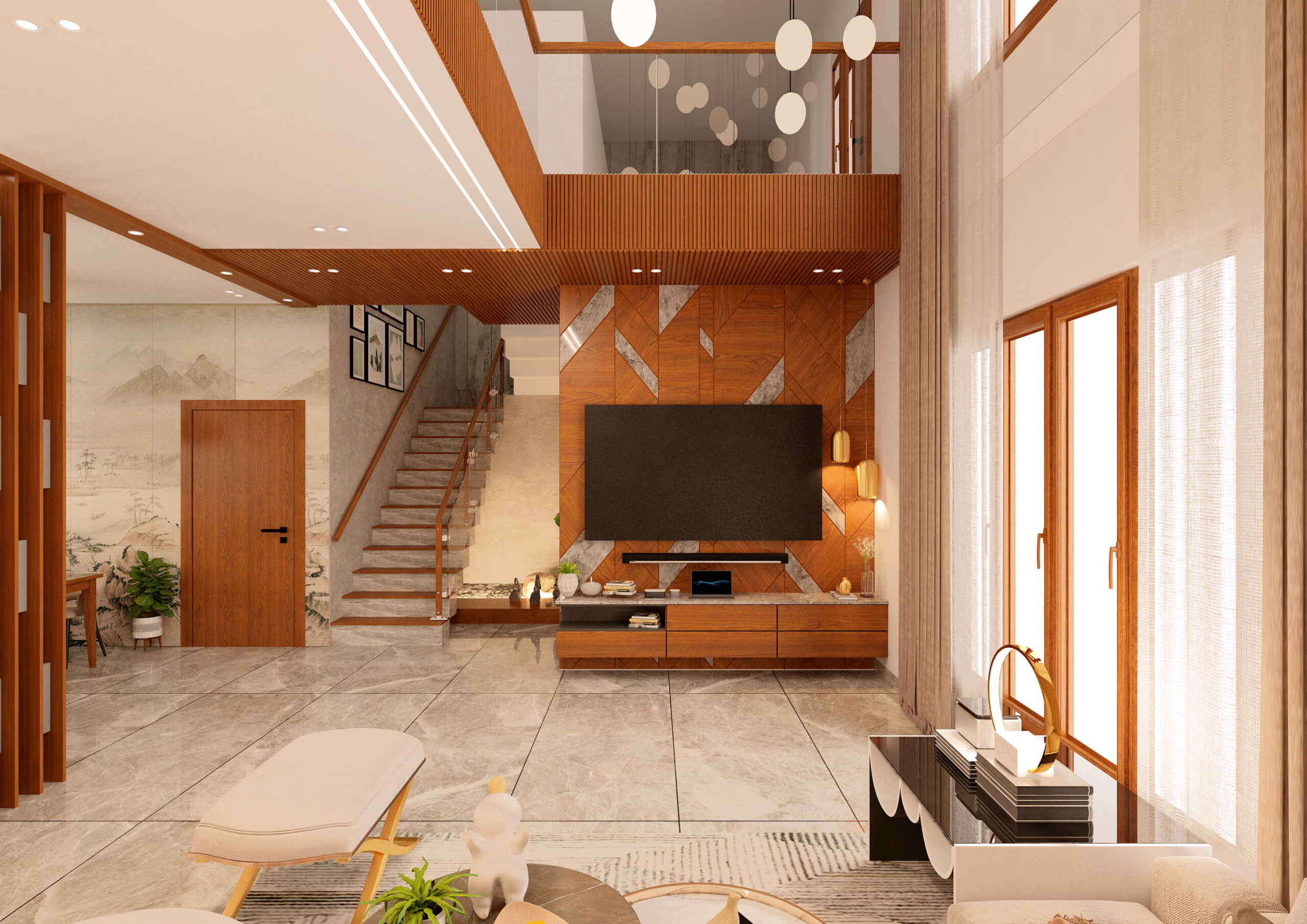 The living room, with its double-height ceiling, presented a unique opportunity to create a truly impactful space. Here, we focused on creating a sense of grandeur while maintaining a cozy, welcoming atmosphere. Layered lighting, dramatic wall treatments, and carefully selected furniture pieces brought the room to life, emphasizing the vertical space while maintaining a warm, inviting ambiance.