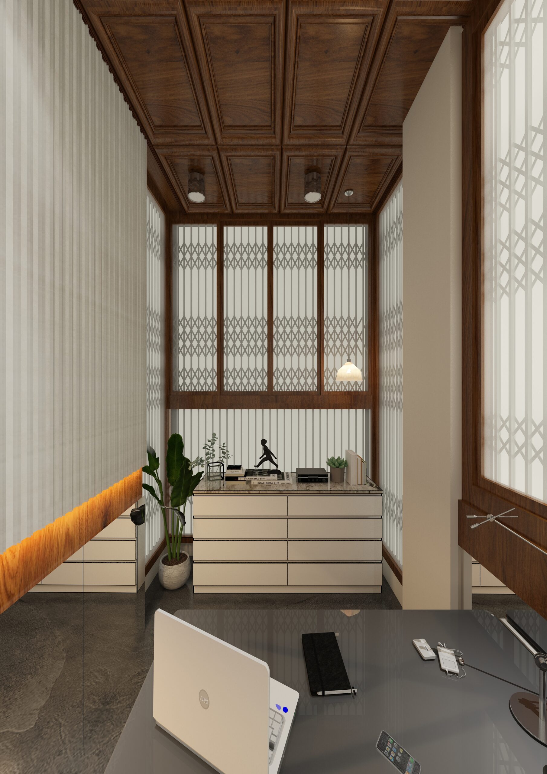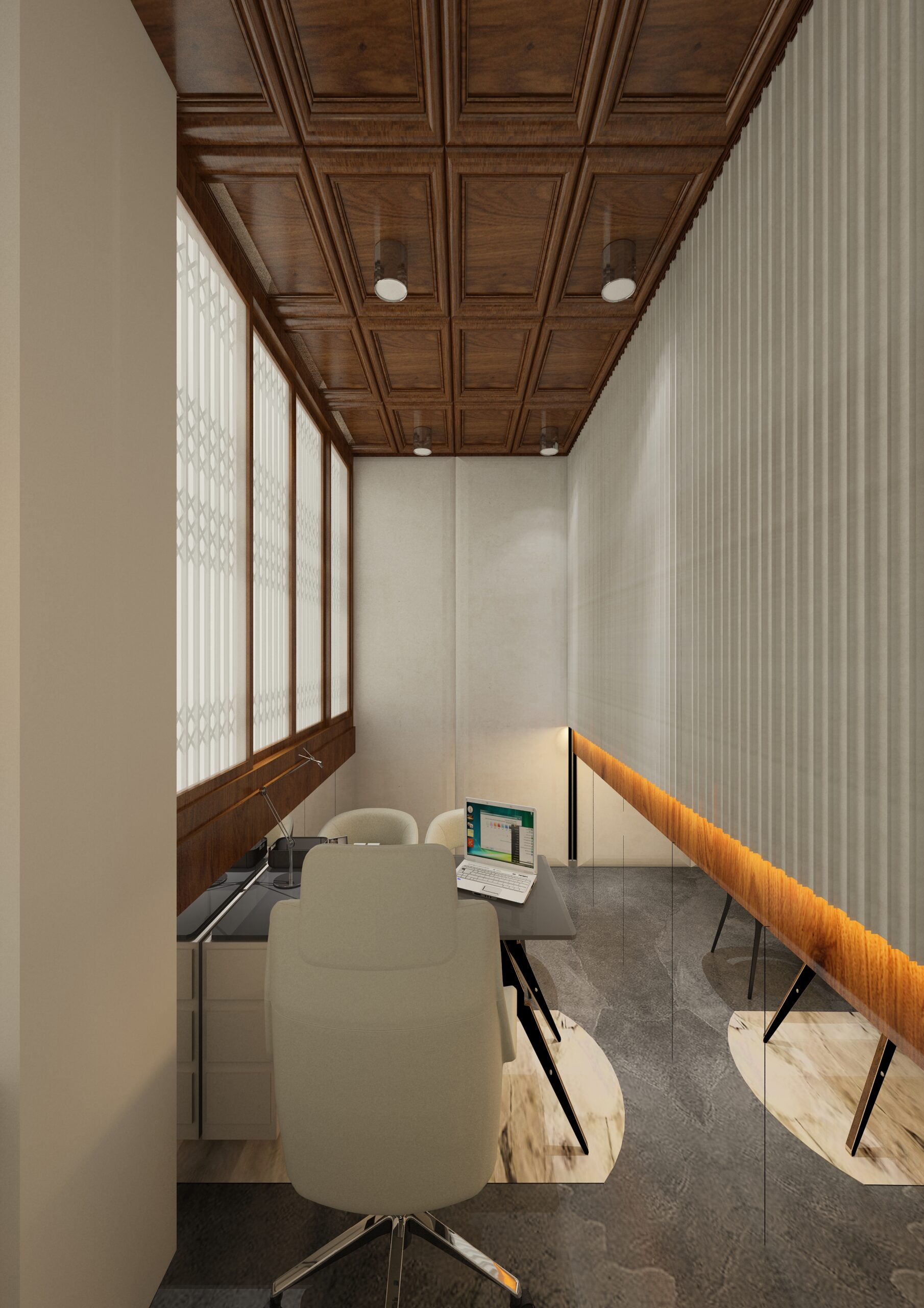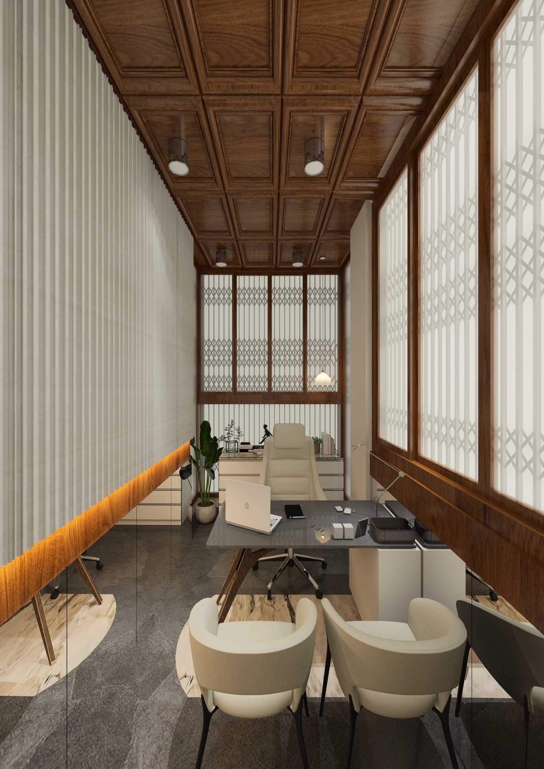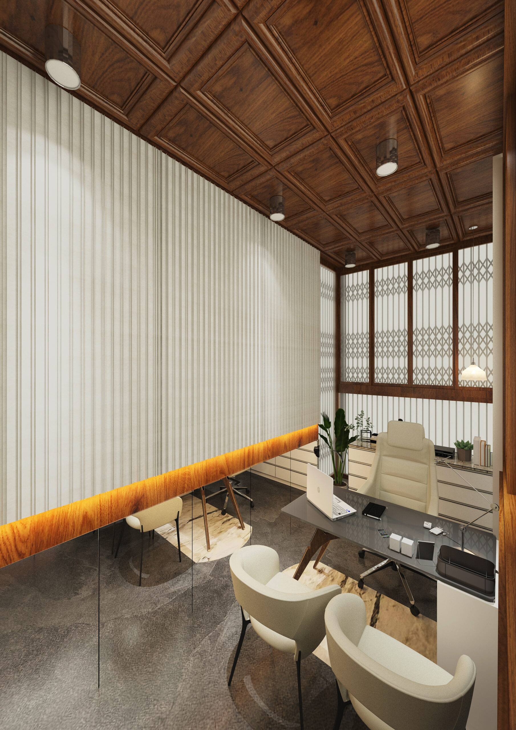▪️The ceiling features rich wooden panels that reflect the traditional and professional image of a lawyer’s office
